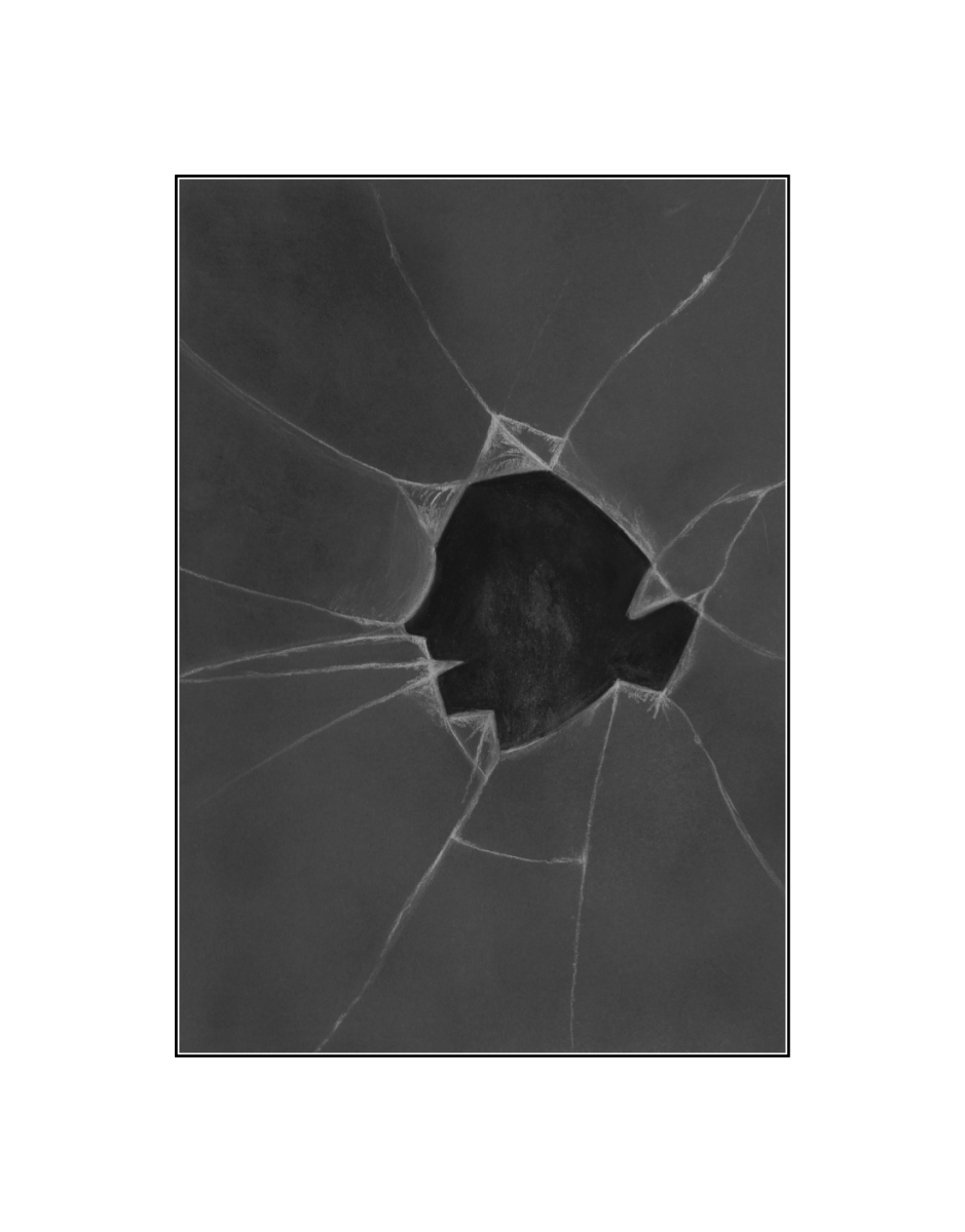 Biały i czarny węgiel, tusz i akryl na szarym papierze. Wymiary: 30 cm x 42 cm